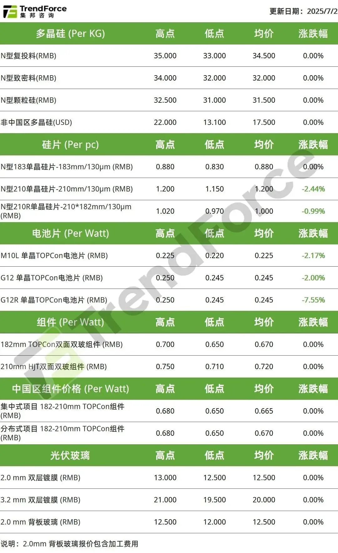 本周组件价格:182双面双玻TOPCon组件主流成交价为0.67元/W,210双面双玻HJT组件主流成交价为0.72元/W。