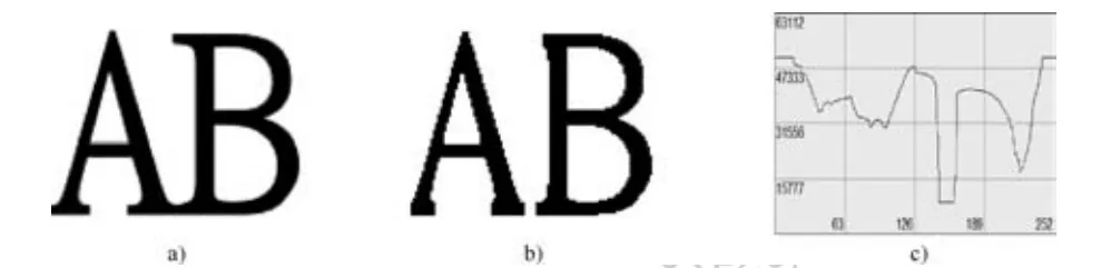 用贝叶斯分类器等机器学习算法进行字符识别的第一步就是将文本分割成单个字符。在字符分割前,对于图1和图2这类图像,需要通过投影变换和极坐标变换将文本变换成矩形排列。对于大部分字符分割,采用分割技术已经足够了,但是对于粘连字符需要采用针对性技术。如图3所示,图3(a)是MingLiU-ExtB字体的文本,两个字符呈粘连状态。对于这类的粘连字符,首选的方案就是用开或闭运算对其进行分割,这里采用3×11结构元进行闭运算(前景为白色),结果如图3(b)所示。之所以采用细长结构元,是为了防止在分割时造成字符在水平方向断开。此外,我们还可以将二维图像的像素灰度值投影到一维的水平轴上,即行剖面,然后根据波峰或波谷确定粘连位置。图3(c)为图3(a)行剖面,可以看到,在水平坐标126附近有一波峰,对应的就是粘连位置。