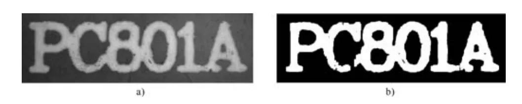 另外,对于诸如“i”、“j”或点阵之类的字符,在分割前需要进行膨胀或腐蚀处理,以使单个字符连接到一起。如图5所示,图5(a)是产品包装上常见的点阵字符串,图5(b)是对图5(a)二值化后再腐蚀的结果。经过这样的处理,单个字符都连接起来了,不会出现一个字符分割成几部分的情况。