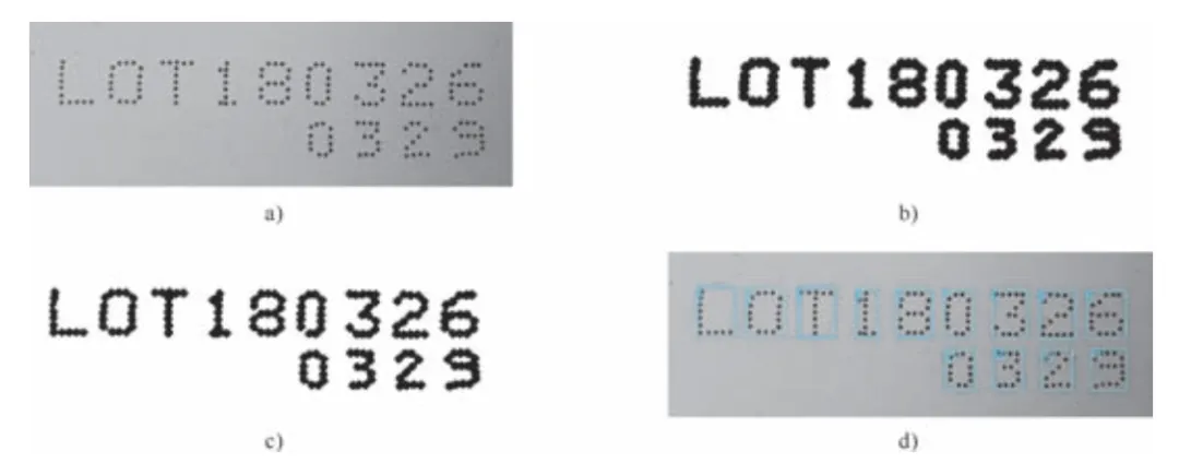 (a)包含训练字符的原图(尺寸871×730像素);(b)对图(a)二值化后再腐蚀(自动阈值,5×5八边形结构元);(c)对图(b)区域分析后得到的包含字符的矩形框;(d)用35×1矩形结构元对图(b)腐蚀后再区域分析
