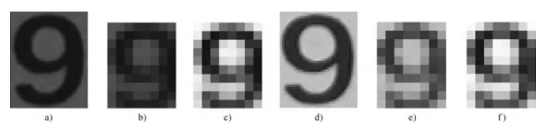 但是这样直接缩放是有问题的。图6(d)是光照发生变化的字符“9”图像,图像亮度更高,缩放到8×10后的图像如图6(e)所示。图6(b)与图6(e)灰度值差异较大,这样会造成后续的分类很困难。解决这个问题的方法就是在缩放前对灰度值进行归一化处理。归一化可以理解为一种灰度拉伸,是将图像的动态范围[r1,r2]映射到[0,1],即
