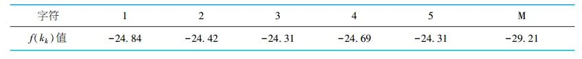 训练完毕后即可进行字符分类。如图8所示,图8(a)是包含待识别字符的原图,其中有未训练字符“M”。如果直接分类,结果如图8(b)所示,“M”识别成了“7”。现在我们观察用式1计算的各字符的f(kk)的值,如表1所示。可以发现,“M”的值f(kk)要明显小于其他字符,因此我们用阈值,比如-26,进行异常检测,结果如图8(c)所示,“?”表示异常字符。