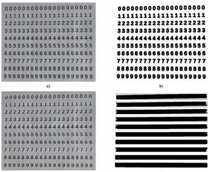 如图7示,图7(a)是包含训练字符的原图,数字0~9,共10行,每行20个字符。图7(b)是用自动阈值对图7(a)分割后再腐蚀的结果。图7(c)是区域分析后得到的包含字符的矩形框。提取每个字符的特征并生成样本后,还需要标记每个样本。如果矩形框的排列顺序未知,那么可以用细长结构元对图7(b)进行腐蚀,结果如图7(d)所示,通过区域分析得到包含每行字符的矩形框。对于图7(c)中那些矩形框中心落入图7(d)同一矩形框内的字符做相同的标记。对样本标记后,就可用分类器进行训练了。