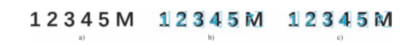 但是,上述的形态学方法并不总有效。如图4所示,图4(a)为字符粘连的图像,图4(b)是对二值化后的图4(a)进行开运算的结果,由于图4(a)与图3(a)的前景相反,所以用了相反的形态学算法。从图中可以看到,除了“C”和“8”,“1”和“A”外,其他粘连字符并未分开。对于这类重度粘连的字符,如果是等宽字符,可以在确定了首字符的位置后,根据字符宽度进行分割。对于非等宽字符,如果不同宽度字符出现的位置是确定的,也可以根据字符宽度进行分割。