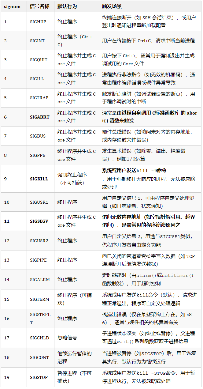 SIGSTOP(19) - 用户自定义信号:可由程序自由定义处理逻辑,常用于进程间通信或调试。