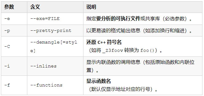 addr2line 是一个用于将程序地址(如内存地址)转换为源代码位置(文件名和行号)的工具。以下是其常用参数的详细含义: