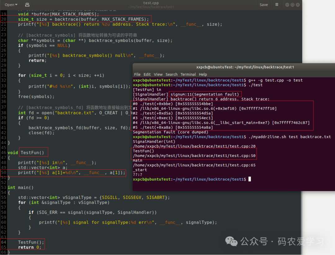 本篇介绍了如何使用backtrace工具来定位Linux应用程序崩溃的位置信息,首先通过signal捕获崩溃信息,然后通过backtrace记录崩溃时的堆栈调用信息,最后使用addr2line来显示对应的崩溃时的代码行号。