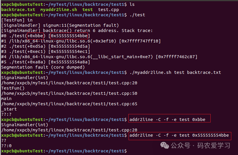 最后使用addr2line函数,将地址转换为可读的函数名和行号。