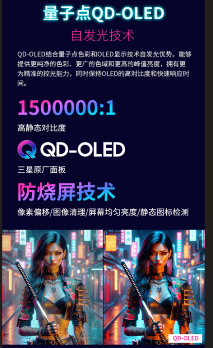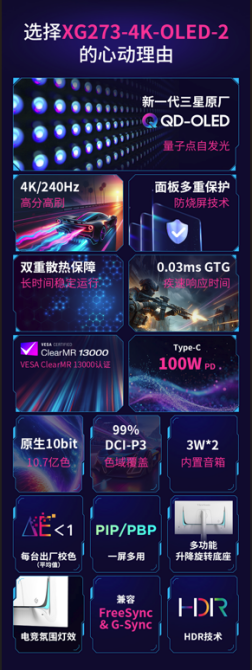 XG273-4K-OLED-2搭载第四代三星QD-OLED面板,以量子点技术与自发光OLED的深度融合,呈现出色彩纯度与色准表现更优的画面;并且,该面板还凭借像素偏移、图像清理、屏幕均匀亮度、静态图标检测等防烧屏技术,提升屏幕寿命,用户可以放心长时间使用设备。