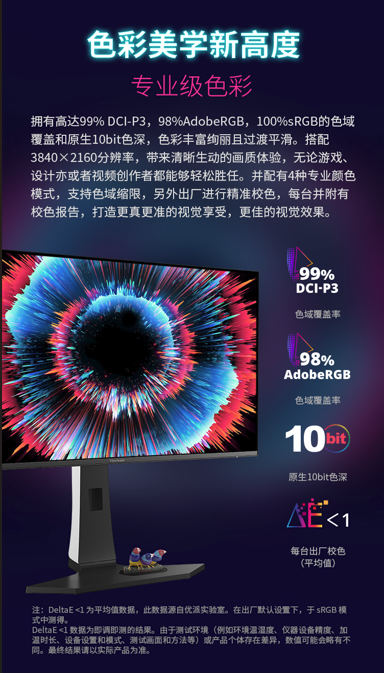 色彩表现更是其核心亮点:sRGB色域覆盖率达100%,DCI-P3广色域覆盖99%(满足电影级后期需求),Adobe RGB色域覆盖98%,配合出厂预校准的优异色准(ΔE<1),真正实现了从日常娱乐到专业创作的全场景色彩精准还原。无论是暗场游戏中的隐藏细节,还是影视作品中的绚丽画面,这块屏幕都能一一呈现。原生10bit色深技术加持,带来10.7亿色真彩显示能力,色彩过渡细腻平滑无断层;不仅能精准还原色彩渐变中的每一处微妙差异,更能充分满足专业设计、影视后期等场景对色彩精度的严苛需求,为您呈现更具沉浸感的鲜活视觉体验。