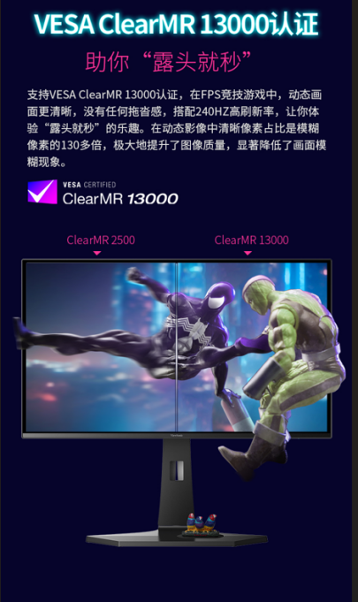 此外,XG273-4K-OLED-2显示器通过了VESA ClearMR 13000 认证,意味着其在动态画面中,清晰像素与模糊像素的比例高达130:1,远超传统标准。无论是敌人快速穿梭的身影,还是猛然爆发的技能画面,都能以锐利的画质呈现,让玩家告别扰人的画面拖影与模糊。搭配 240Hz 高刷新率,这块屏幕让你在 FPS 游戏中真正做到“露头就秒”,每一次瞄准都快人一步,每一次出击都精准致命。对职业选手与硬核玩家而言,这不只是技术的加持,更是胜利的保障。