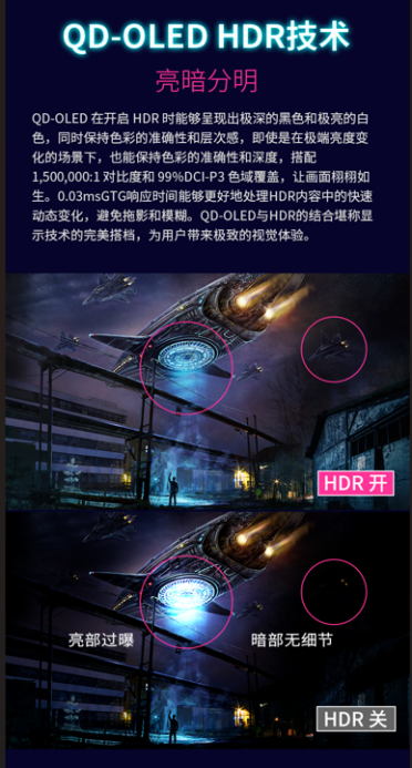 XG273-4K-OLED-2 显示器还搭载了先进的 QD-OLED HDR 技术,亮暗对比分明。无论是极亮的光源还是深邃的暗部细节,都能精准还原,避免过曝与细节丢失。