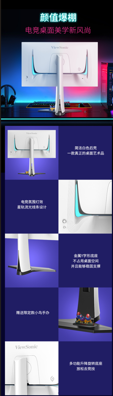 XG273-4K-OLED-2 不只是一台性能强悍的电竞显示器,更是一件点亮桌面的艺术品。其白色雕刻后壳搭配星战风格的流光灯效,营造出未来感十足的电竞氛围,成为桌面美学的新风尚。金属设计的 Y 字形底座不只节省空间,还稳固可靠,配合可升降、旋转的多功能支架,让玩家在长时间游戏中也能保持舒适姿态。更贴心的是,包装内还附赠隐藏款小鸟手办,为你的桌面增添一份个性与趣味。