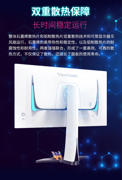 在高性能输出的背后,XG273-4K-OLED-2采用了石墨烯+铝制散热片的双重散热结构,实现了无风扇静音运行。石墨烯具备极高的导热性与稳定性,能迅速将热量从核心区域导出;铝制散热片则具备优异的耐腐蚀性与结构强度,确保长时间使用依然高效可靠。两者协同作用,构建出一套高效、静音、耐用的散热系统,不只保障了显示器在高负载下的稳定运行,还有效延长了面板寿命。无论是长时间游戏、直播还是创作,都能保持冷静输出,助玩家稳定发挥。