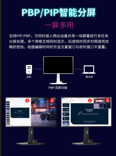 XG273-4K-OLED-2不只是一台电竞显示器,更是多任务处理的得力助手。PBP/PIP分屏功能让玩家可以同时接入PC和游戏主机,或者边游戏边查阅攻略,提升效率。