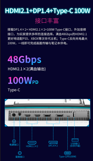 丰富的接口配置,包括双HDMI 2.1、双DP 1.4和100W Type-C,满足了从次世代主机到高性能笔记本的全场景连接需求。
