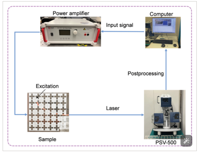 实验过程:样品是通过激光切割技术对长度、宽度和厚度分别为36、36和2mm的铝板进行穿孔制成的,精度为0.2μm。激发源是通过压电盘产生的,该压电盘连接到固定在样品表面的铝贴片,用于激发面外和面内模式。压电盘由计算机发出的0.01-1MHz的调制信号驱动,并由功率放大器(Aigtek,ATA-2021H)放大。使用扫描激光测振仪捕获样品的振动响应。
