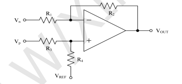 通过合理设置外围电阻的阻值,可实现对双端输入信号的差分放大。例如,当R4/R3=R2/R1时,输出电压Vout =(Vp-Vn)x R2/R1+VREF,该电路在工业传感器信号处理、音频信号处理等场景中广泛应用,能够有效抑制共模干扰,提取差分信号中的有用信息。