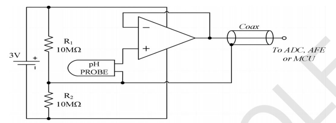 该电路可将MCP6001/2/4系列配置为电压跟随器模式,输入信号通过10MΩ的高阻抗源接入,经芯片缓冲后输出至ADC或MCU等后续处理电路。这种配置适用于驱动低电压、高阻抗的化学传感器(如pH探头),能够有效地减少信号源的负载效应,提高信号的稳定性与准确性。