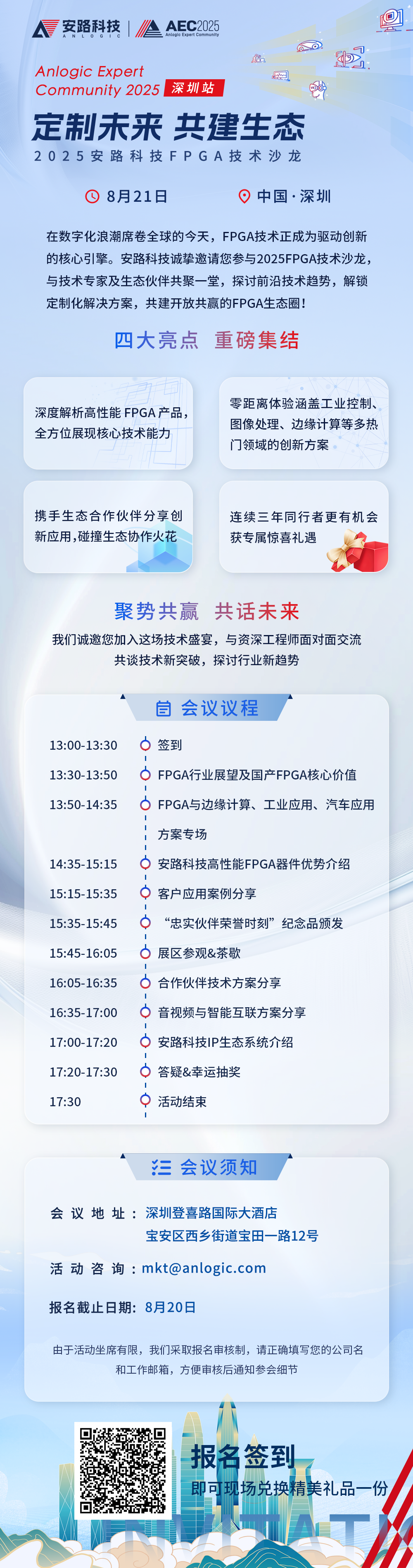 在数字化浪潮席卷全球的今天,FPGA技术正成为驱动创新的核心引擎。2025年8月21日,深圳将迎来一场聚焦FPGA技术与产业应用的盛会——2025安路科技FPGA技术沙龙。本次沙龙以“定制未来 共建生态”为主题,汇聚行业专家、企业代表及技术开发者,探讨前沿技术趋势,解锁定制化解决方案,共建开放共赢的FPGA生态圈!