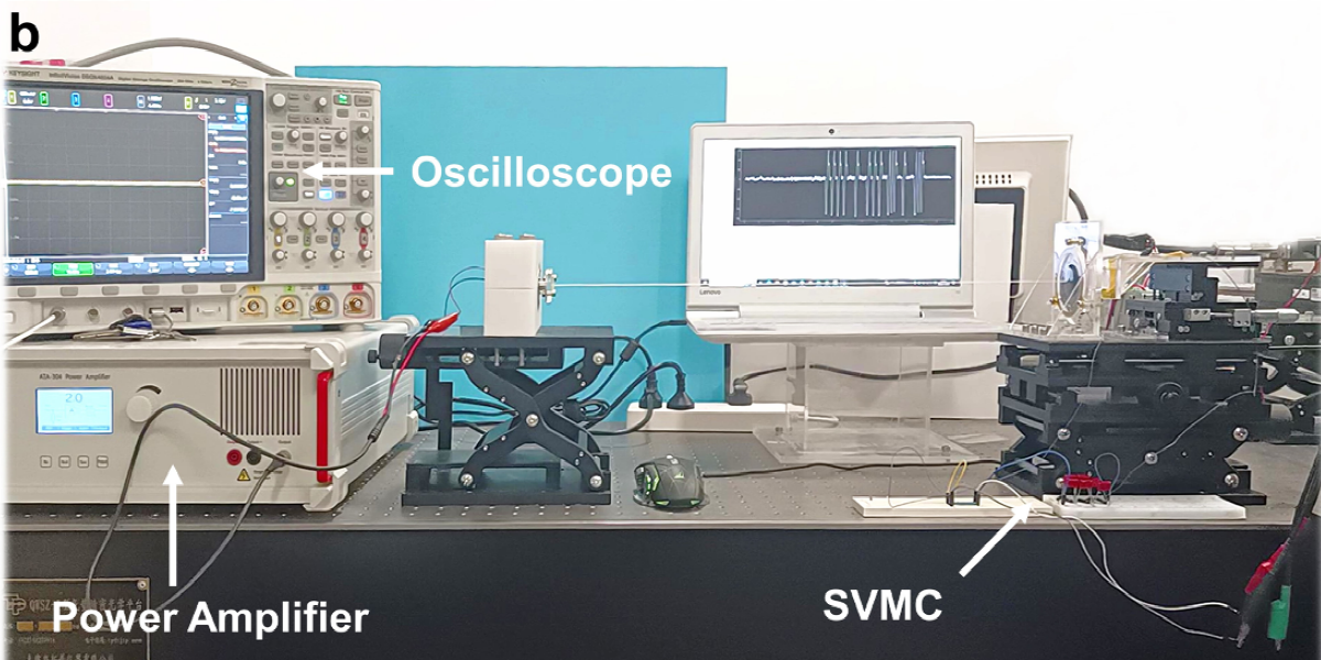 实验内容:土电话,也称为传声筒,是一种古老的交流和娱乐工具,它利用声振动传播的原理来传递声音,是一种不依赖电的机械形式的“电话”。基于这一原理,将振动器作为传输信号的一端,另一端为所设计的摩擦电传感器,二者之间连接一根细绳,构成弦振动自供电机械波通信系统。将信号发生器产生的信号通过功率放大器放大,用以驱动振动器振动,通过弦线传输到摩擦电传感器,在传感器端接收处理,实现调制信号的产生、传输与解码。