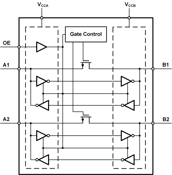 芯片集成电气隔离功能,当使能引脚OE或任意一路电源VCCx为低电平时,所有I/O端口将进入高阻状态,实现双向隔离。VCCA与VCCB无上电时序要求,支持信号传输方向的自动识别,无需外部控制,简化了系统设计。