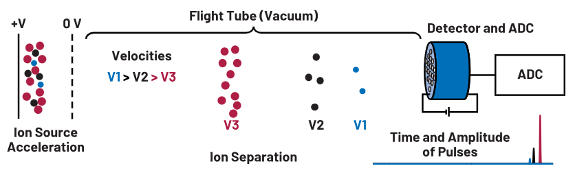 在TOF MS中,短时电离事件形成的离子通过静电场加速,因此不同m/z的离子具有相同的动能,但速度不同。这些离子随后沿着无场漂移路径行进,并以不同的飞行时间到达检测器——较轻的离子先于较重的离子到达,如图2所示。在实践中,由于加速区域中初始空间分布和能量(或速度)的差异,相同m/z的一组离子的飞行时间会分布形成一个窄至几百皮秒(ps)的脉冲。每个脉冲是对应于多个独立离子到达事件的信号之和,通常由半峰全宽(FWHM)参数来表征。