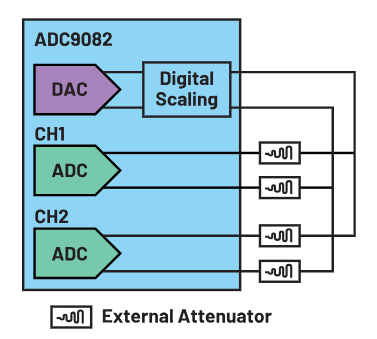 最大20 dB衰减的弱信号测量:CH2直接连接到DAC输出作为参考,缩放-16 dBFSC;CH1将10 dB衰减器对用于<32% FS信号,将20 dB衰减器对用于<10% FS信号。