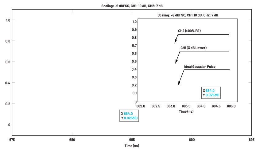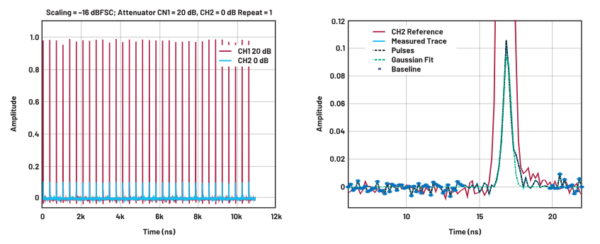 对于每次测试,我们采集>10 ?s数据,并重复进行数据采集10次以检查重现性。我们在MATLAB?中基于数据绘制曲线并进行分析。对于每种测试情况,将10次重复采集数据进行对比并绘制曲线。图4显示了测试中的单个脉冲,其中CH1比CH2低3 dB。两个通道的10次重复采集很好地重叠,表明数据采集具有高重现性。