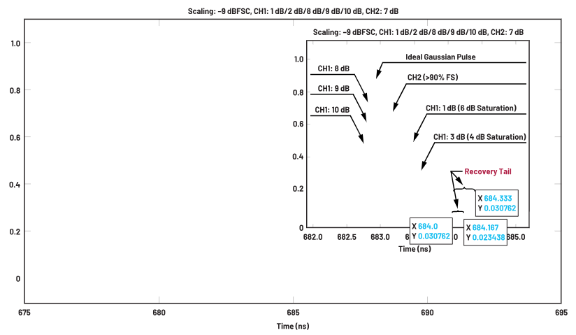 AD9082 ADC具有过载保护电路,如果输入幅度超过上限,此电路将会激活。如果保护电路被激活,则在脉冲的下降沿通常会出现恢复拖尾,从而导致FS处出现峰值削波和恢复拖尾。较短的恢复拖尾对于时间精度很重要,因此对于TOF MS的质量测量也很重要。图5显示了饱和(最高6 dB)或衰减的五种情况的曲线。对于6 dB饱和,恢复拖尾小于0.4 ns,表明保护电路激活时恢复展宽极小。