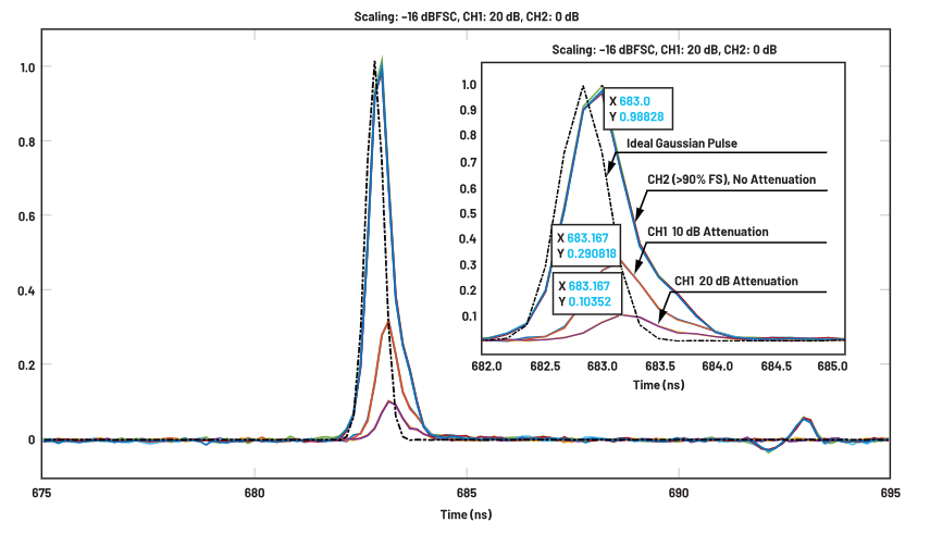 MxFE可智能集成RF ADC、数模转换器(DAC)、片内数字信号处理和时钟/锁相环(PLL),支持多芯片同步。市场上也有仅配备高速ADC的MxFE器件。为了简化起见,我们的基准测试使用了 AD9082 ,其集成了ADC和DAC,如图3所示。集成DAC用于生成FWHM为0.5 ns的窄高斯脉冲串,其幅度由数字缩放和外部衰减器组合来控制。高斯脉冲比用于ADC表征的典型单音信号更接近质谱中的信号。设置两个ADC通道对信号进行数字化处理:CH1针对通过改变外部衰减器使之饱和或衰减的各种幅度;CH2作为参考,用于高于90%满量程(FS)且未饱和的信号强度。在我们的测试中,采样速率为6 GSPS,以便为每个脉冲提供足够的样本。