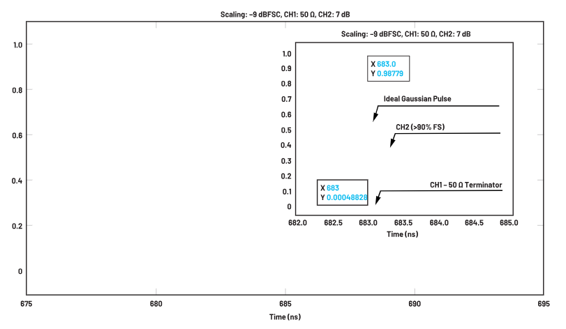 图9显示了输入为10% FS的测试情况的完整采集图,以及使用高斯拟合和分段基线的单个脉冲放大图。表1列出了平均值、测得的FWHM和计算的SNR。