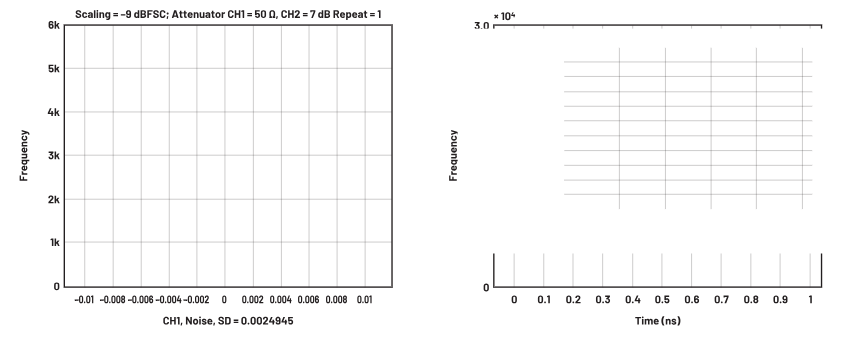 噪声测量:CH2以固定7 dB衰减器对作为参考;CH1使用50 Ω端接电阻。