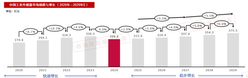 - 2024年中国工业传感器市场规模为308.8亿元,同比下降9%。相比2020年到2023年间市场规模的上涨态势,2024年工业传感器市场规模的增速出现较为明显的下滑。市场规模下滑是下游需求分化、国际供应链扰动等多重因素叠加的结果。
