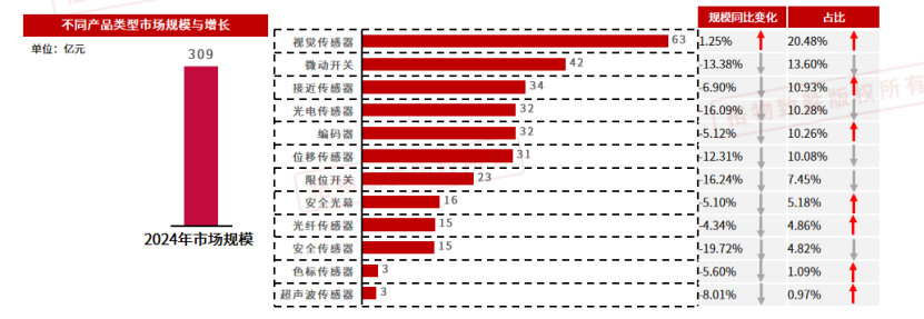 - 光伏&锂电池、汽车(燃油汽车)行业及传统制造业等行业的需求减少是导致2024年工业传感器市场规模减小的主要原因。