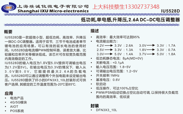 该芯片广泛适用于电池产品、4G/5G 模块、AIOT 设备及 POS 系统等场景,无论是便携式电子设备,还是需要稳定通信与数据处理的终端,都能借助 IU5528D 实现高效供电,提升设备整体性能与续航表现。