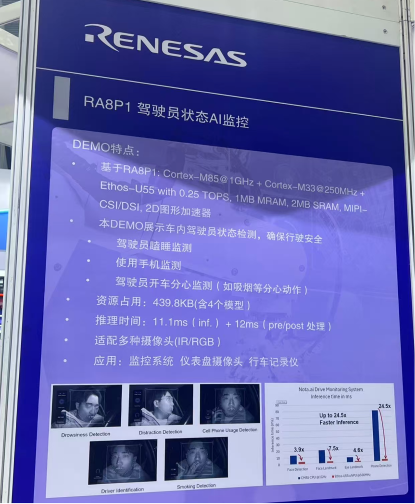 此外,该MCU方案还具备高集成度优势,无需外扩DRAM和电源管理芯片,单芯片即可解决问题,简化设计。在一个单芯片实现驾驶员状态监测的demo演示中,RA8P1单颗芯片就能实时处理摄像头数据,准确识别驾驶员是否疲劳驾驶、分心或打电话。这也充分展示了其作为“跨界产品”的实力——在保持MCU实时性和低功耗优势的同时,提供了接近MPU的应用处理性能。