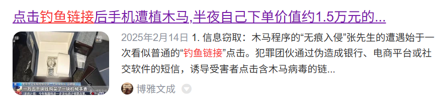 钓鱼链接是通过伪装成可信网站链接来欺骗用户的恶意链接。这些链接往往通过伪造银行、电子商务平台或社交媒体网站来引诱用户点击。一旦用户点击,恶意软件可能会被下载,或者用户会被引导到一个伪造的登录页面,泄露个人信息,甚至还会有财产损失。