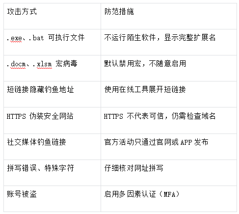 - 钓鱼邮件或网站可能会诱导用户下载 .exe、.scr、.bat 等可执行文件,并声称是“重要文档”、“发票”、“安全补丁”等。