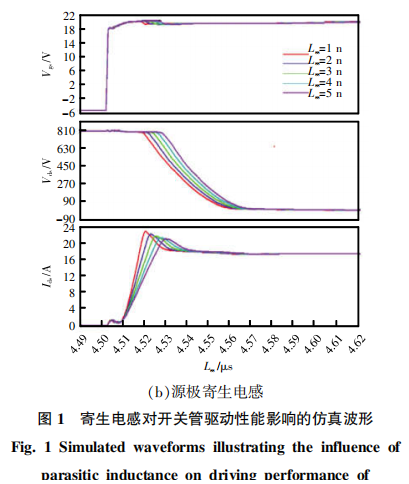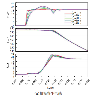 图?1?为栅极和源极的寄生电感变化时?SiCMOSFET?开通过程的仿真波形.根据仿真结果分析可得:Lgs?对栅源电压的影响较大,当栅极寄生电感增大时,?栅源电压的振荡幅度也会相应的增大;而对于源极寄生电感?Lss,随着取值的增大,Vgs?在开通过程中会出现一定的电压幅值跌落,但是从漏源电压?Vds?及漏源电流?Ids?的角度看,Lss?的增大并未使其波形出现恶化,反而在一定程度上抑制了?Ids?波形的幅值振荡,但?Lss?也不能过大袁过大的?Lss?会使?SiCMOSFET?的开关导通时间增加,?从而增加?SiCMOSFET?的开通损耗。导致栅源电压出现过电压及振荡是由于驱动回路中栅极寄生电感?Lgs?和源极寄生电感?Lss?与驱动回路中栅极电阻?RG、栅源极结电容?Cgs?形成了?LCR?谐振电路。?栅源极电压可根据驱动回路方程求得,即