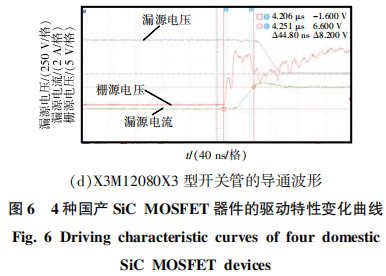 本文选用?4?种具有代表性的相同电压,电流等级的国产?SiC MOSFET?器件进行对比,比较进口器件和国产器件在驱动特性方面的差异,在进行对照实验时,除替代器件外,其他器件均保持一致,即采用国产?SiC MOSFET?器件代替进口器件进行实验,同样选取驱动电压范围为?16~22 V遥,在驱动电压为18 V?时,4?种国产?SiC MOSFET?器件的驱动特性变