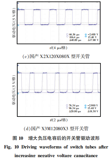 由表?1?还可以看出,4?种典型国产?SiC MOSFET器件的输入电容均大于进口?SiC MOSFET?器件,为验证表?1?这个结论,在相同条件下对?C2M0080120D?型进口器件和?4?款国产器件进行负压测试,?得到的替代前、后驱动电压波形对比如图?9?所示。?可见,在将进口器件?C2M0080120D?替换为国产器件后,开关管的负压均在减小,?为避免出现开关管负压下降情况,可采用增大负压电容?C1?容值的方法袁,如图?10?中将负压电容容值从?47 nF?增大至?100 nF?后、国产器件开关管负压值均得到了提升。