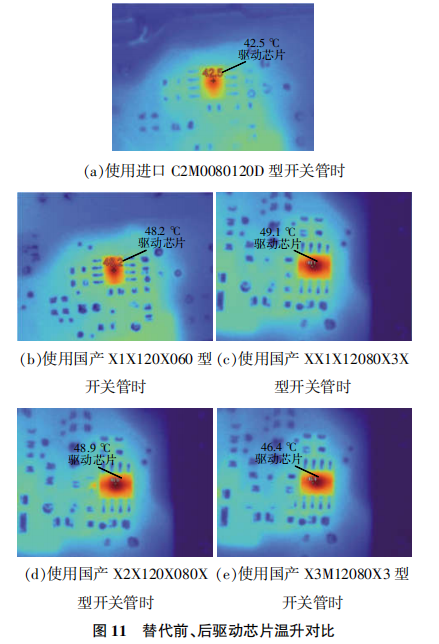 表?2?为进口功率管和?4?种典型国产功率管栅极总电荷参数的对比,?可以看出,国产功率管替代后栅极总电荷?Qg?增大,相应的驱动损耗会增大,从而使得驱动芯片的温度升高,为验证驱动芯片的温度变化,对相同工况下对应驱动芯片中的器件温升情况进行对比测试,结果如图?11?所示。