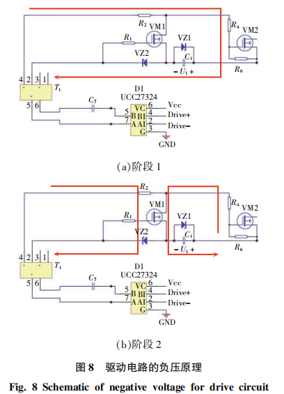 阶段?1:根据驱动电路设计方案,驱动芯片的负压来源于串接在驱动回路中储能电容?C1?上的储能,以及与之并联的稳压管?VZ1?的钳位作用,如图8(a)所示,当主功率管?VM2?开始驱动后,储能电容?C1?上的电压逐步抬高,并被?VZ1?钳位限幅为U1,达到周期稳定状态。