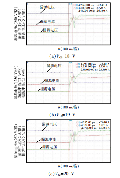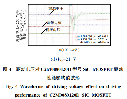因此可以得出结论,?当栅极正压取值范围为18~20 V?时,C2M0080120D?型号?SiC MOSFET?的驱动特性较好遥,由图?4?和图?5?还可见,栅源电压仍出现了部分振荡现象,这是由功率回路及驱动回路的寄生电感等杂散参数引起的。