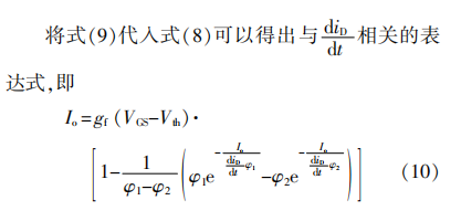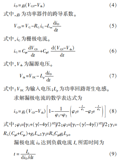 开通电流变化率可根据双脉冲测试电路中功率器件漏极电流上升阶段的等效电路进行简化求解。开通过程中,在栅源电压?V?GS?达到导通阈值电压?Vth?时,其沟道打开袁漏极电流?iD?上升,?忽略栅漏极结电容?Cgd?和漏源极结电容?Cds?通过沟道释放电流,可近似地认为漏极电流?iD?等于沟道电流,满足器件的跨导特性,?列写该阶段的数学方程分别为