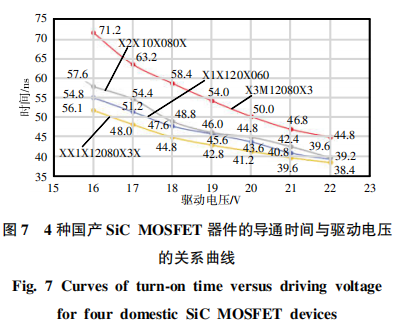 化曲线如图?6?所示,4?种国产?SiC MOSFET?器件的导通时间与驱动电压的关系曲线如图?7?所示遥,可知,在相同驱动电压情况下,4?种国产?SiC MOSFET器件导通所需时间均比进口?SiC MOSFET?所需时间略长,?例如,在?V?GS=18 V?时,进口?SiC MOSFET?的导通时间为?44 ns袁,而4?种国产?SiC MOSFET?的导通时间均大于?44 ns,?此外,开关管的导通时间与其输入
