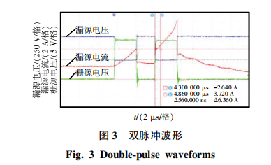 本文搭建了如图?2?所示的双脉冲测试平台,以验证驱动电压对驱动特性的影响,?实验中、?采用STM32 f105RC?芯 片 对 测 试 电 路 进 行 控 制 ,SiCMOSFET?的驱动芯片为?UCC27624,?供电电压为600 V、续流电感为?120 uH,储能电容为?2.47 uF,驱动电阻取值为?10?Ω,驱动电压范围为?16~22 V,实验得到的双脉冲波形如图?3?所示.