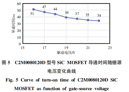 图?4?和图?5?分别为驱动电压对?C2M0080120D型号?SiC MOSFET?驱动性能影响的波形及?C2M0080120D?型号?SiC MOSFET?导通时间随栅源电压变化的曲线。?由图?4?和图?5?可见院随着栅源电压取值的增大,SiC MOSFET?开通所用时间逐渐减少;当栅源电压超过?20 V?时,SiC MOSFET?开通所用时间减少的幅度逐渐变小。