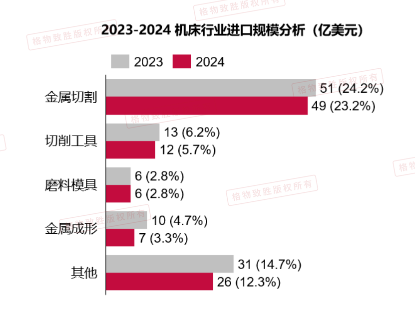 2024年,机床工具行业进口延续了上年下降趋势。主要原因有市场需求不足、技术进步带来的进口替代以及西方国家对高端机床的限制等几个方面。